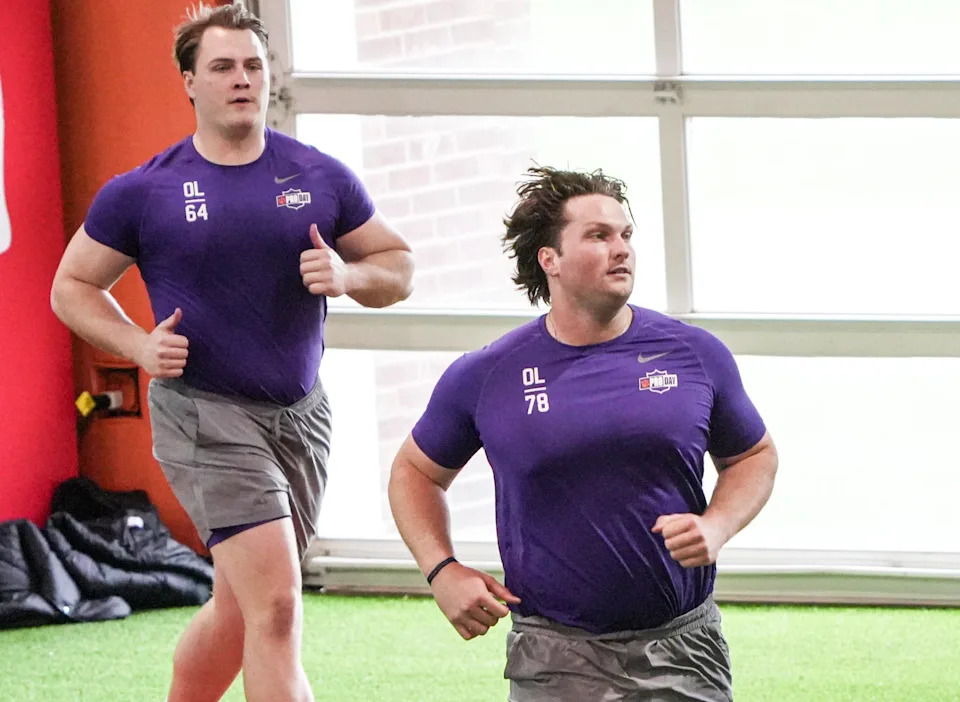 Former Clemson offensive linemen Walker Parks and Walker Parks warm up for performs the offensive line drill during 2026 Clemson Pro Day in the Poe Indoor Facility at Clemson University in Clemson Thursday, March 12, 2026.