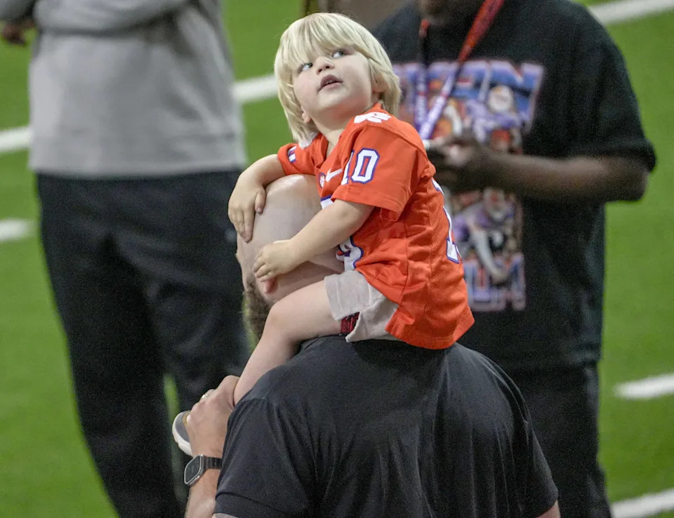 Blue Boulware on the shoulders of his father, Clemson Tigers football linebacker coach Ben Boulware, looking toward the video screen showing live performs the bench press performances during 2026 Clemson Pro Day in the Poe Indoor Facility at Clemson University in Clemson Thursday, March 12, 2026.
