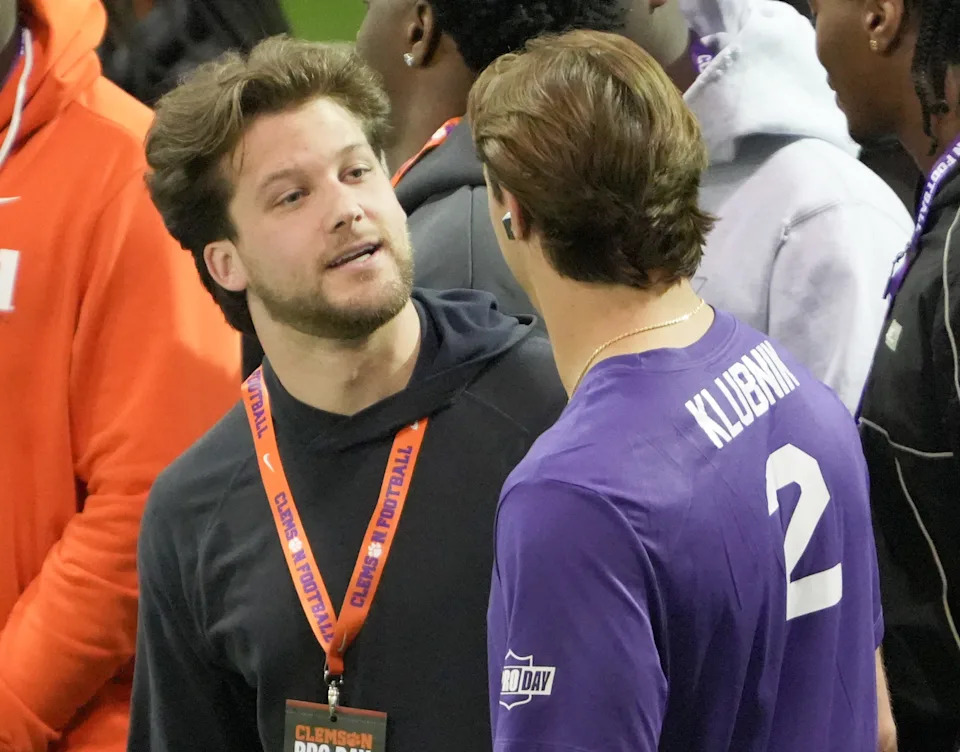 Former Clemson quarterback Cade Klubnick talks with Tyler Venables during 2026 Clemson Pro Day in the Poe Indoor Facility at Clemson University in Clemson Thursday, March 12, 2026.