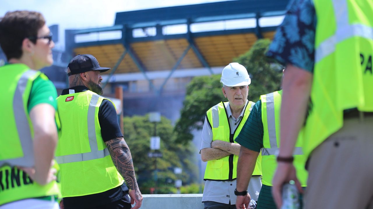 Former Hawaii football coach June Jones, in white hard hat, waited by a barrier for the demolition of a section of Aloha Stadium behind him. (Spectrum News/Brian McInnis)