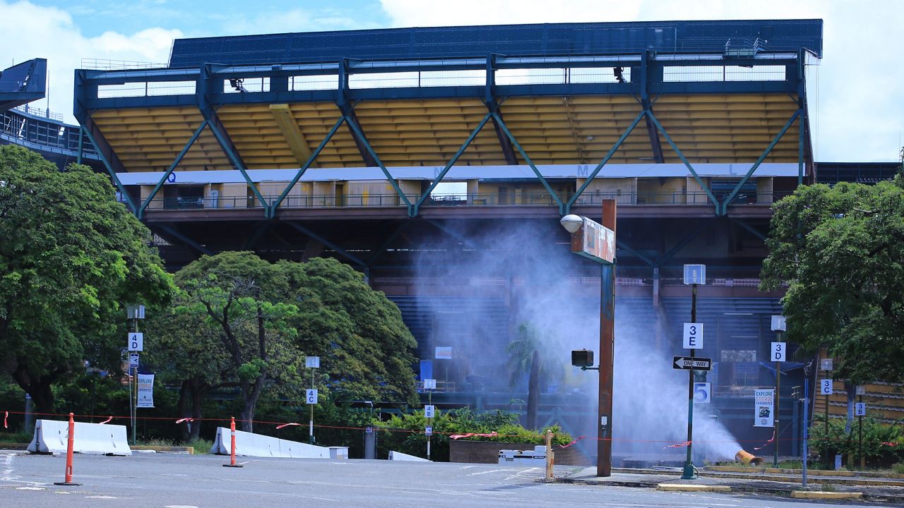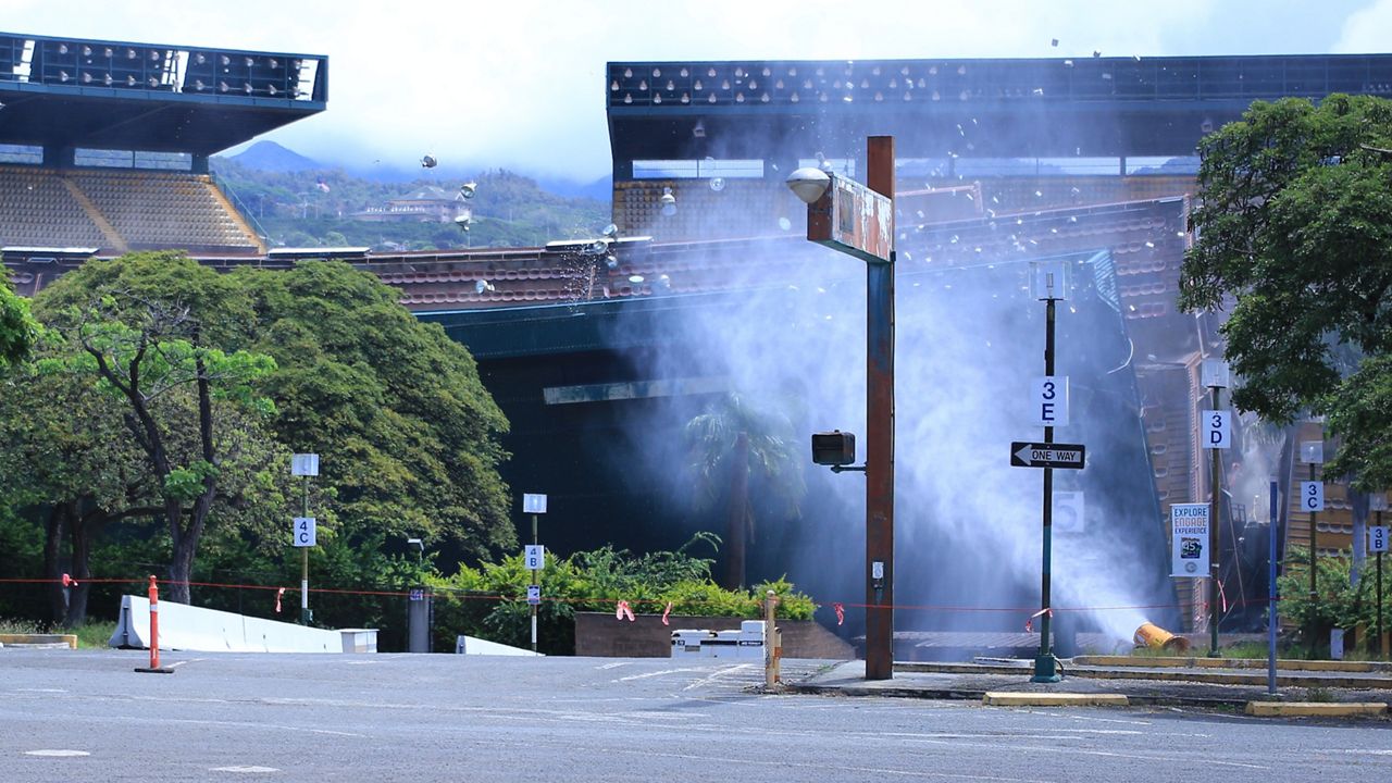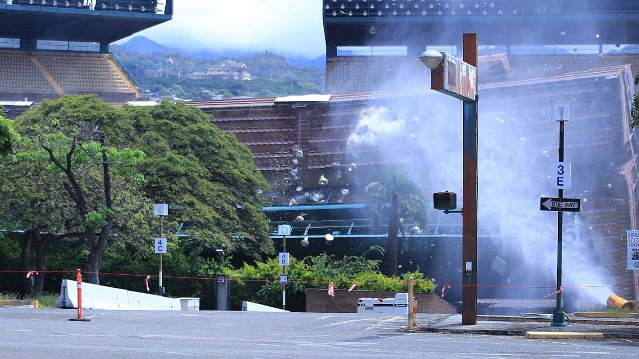 The Aloha Stadium upper section on the makai sideline, sections Q through L, just before Aloha Halawa District Partners brought it down on Thursday. (Spectrum News/Brian McInnis)