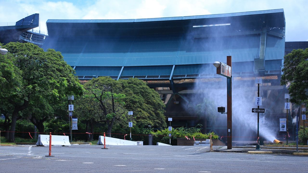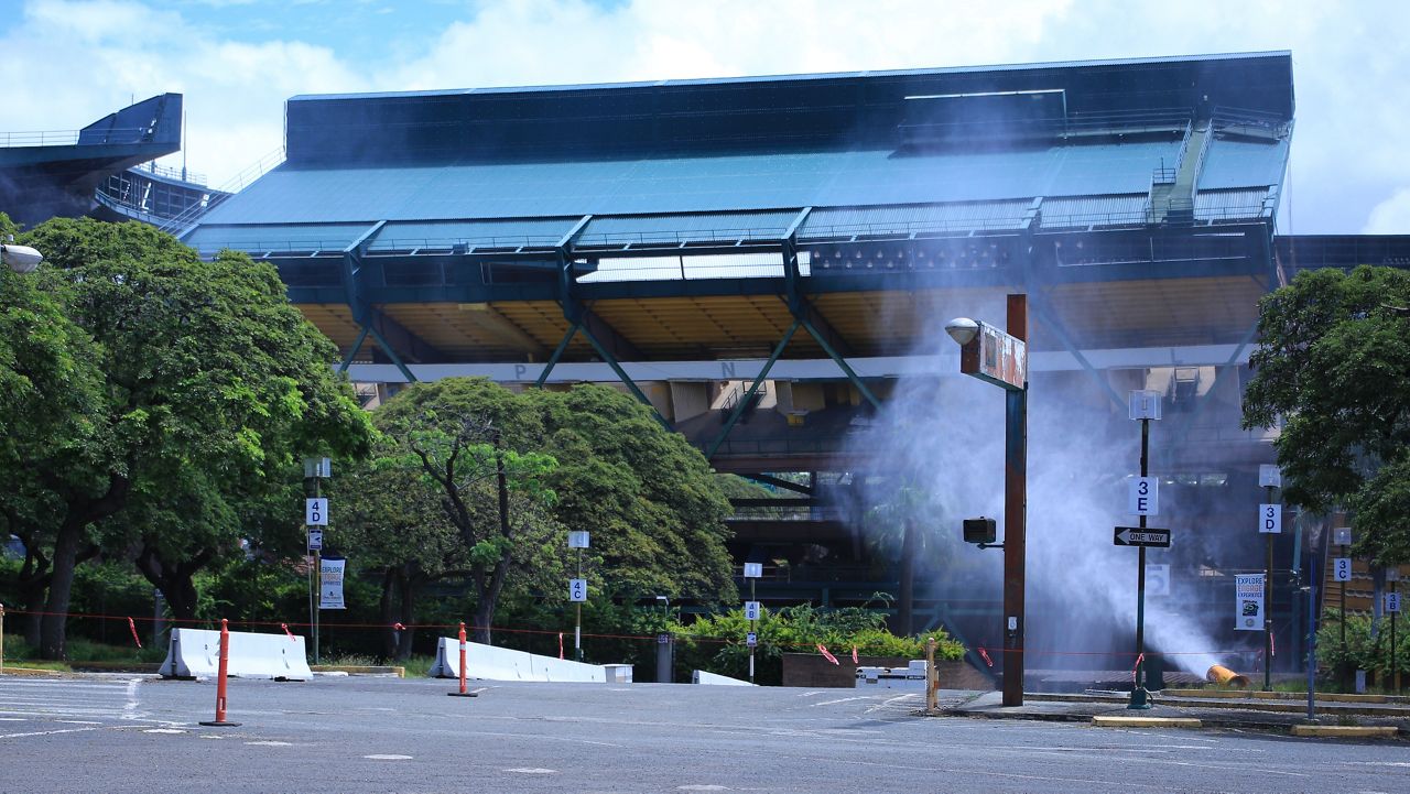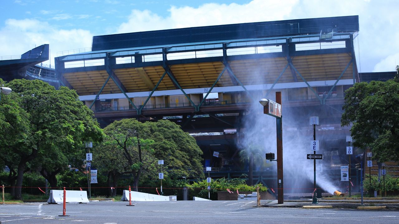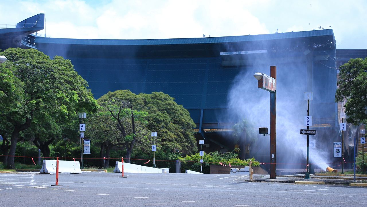 The Aloha Stadium upper section on the makai sideline, sections Q through L, just before Aloha Halawa District Partners brought it down on Thursday. (Spectrum News/Brian McInnis)