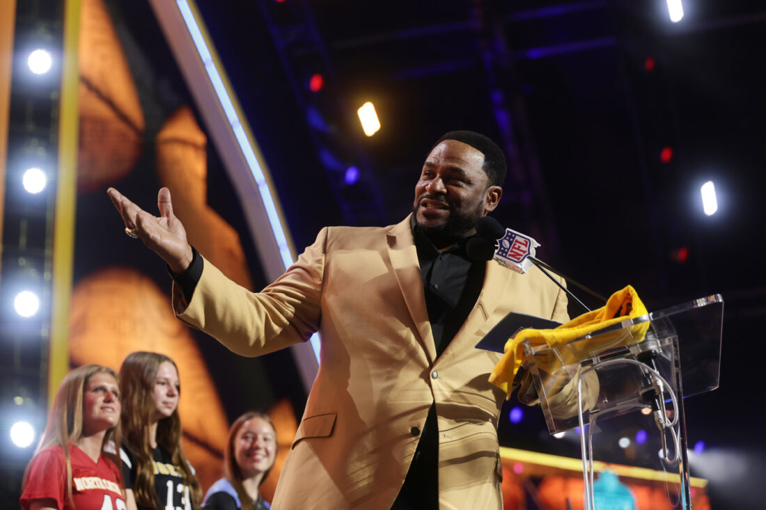 Former NFL player Jerome Bettis speaks on stage during the first round of the NFL football draft in Pittsburgh, Thursday, April 23, 2026. (Adam Hunger/AP Content Services for the NFL)
