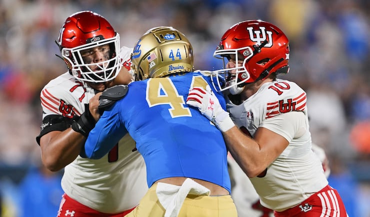 Utah Utes offensive lineman Caleb Lomu (71) and work to block UCLA Bruins defensive lineman Devin Aupiu (44) as Utah Utes tight end Hunter Andrews (10) Utah and UCLA play at the Rose Bowl in Pasadena on Saturday, Aug. 31, 2025. Utah won 43-10. | Scott G Winterton, Deseret News