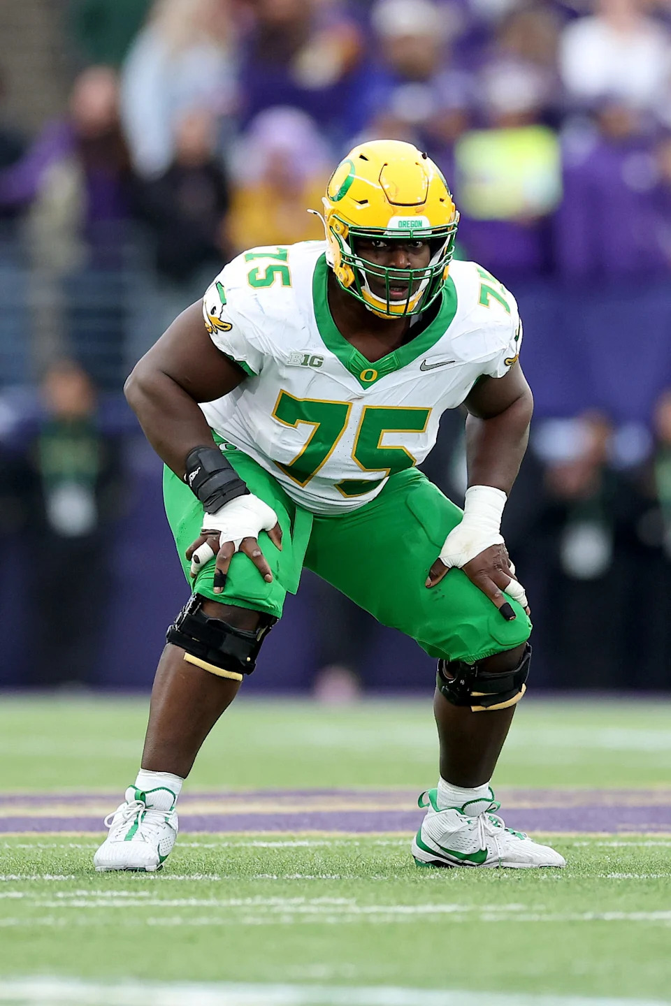 EUGENE, OREGON – MARCH 17: Emmanuel Pregnon #75 of the Oregon Ducks looks on during Oregon Ducks Pro Day at the Moshofsky Center on March 17, 2026 in Eugene, Oregon. (Photo by Soobum Im/Getty Images)