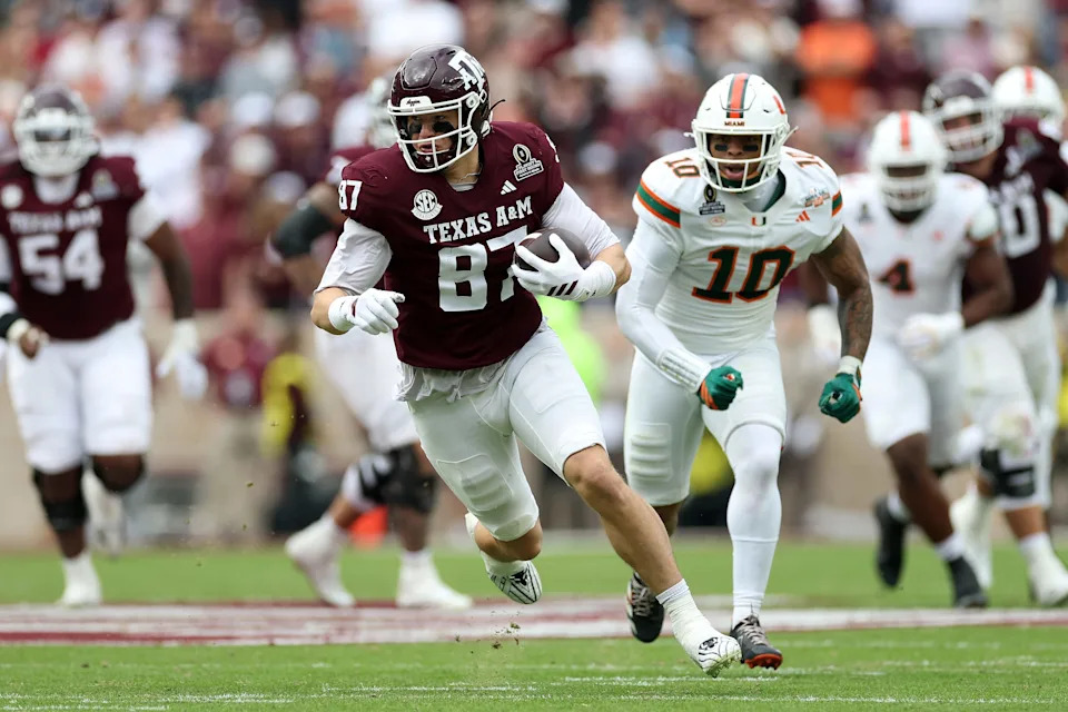 COLLEGE STATION, TEXAS – DECEMBER 20: Nate Boerkircher #87 of the Texas A&M Aggies runs after a catch in the first half against the Miami Hurricanes during the 2025 College Football Playoff First Round Game at Kyle Field on December 20, 2025 in College Station, Texas. (Photo by Tim Warner/Getty Images)