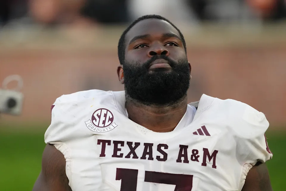 BATON ROUGE, LOUISIANA – OCTOBER 25: Defensive tackle Albert Regis #17 of the Texas A&M Aggies defends during the second half of a game against the LSU Tigers at Tiger Stadium on October 25, 2025 in Baton Rouge, Louisiana. (Photo by Tyler Kaufman/Getty Images)