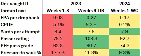 Unfortunately, things got a bit more rough for Jordan Love and company when presented against true high-end competition: All six of their non-Week 18 losses (sorry Bears fans) came against the Eagles, Vikings, and Lions … three of the NFL’s only four teams to win 14-plus games last season.