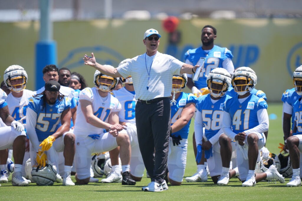 May 7, 2025; El Segundo CA, USA; Los Angeles Chargers coach Jim Harbaugh talks to players during rookie minicamp at The Bolt.