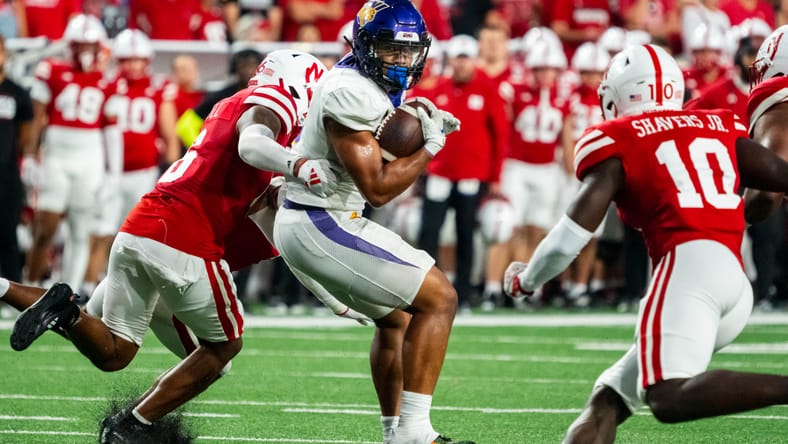 Sep 14, 2024; Lincoln, Nebraska, USA; Northern Iowa Panthers running back Amauri Pesek-Hickson (5) runs against Nebraska Cornhuskers defensive back Tommi Hill (6) as a flag is thrown during the second quarter at Memorial Stadium. Mandatory Credit: Dylan Widger-Imagn Images