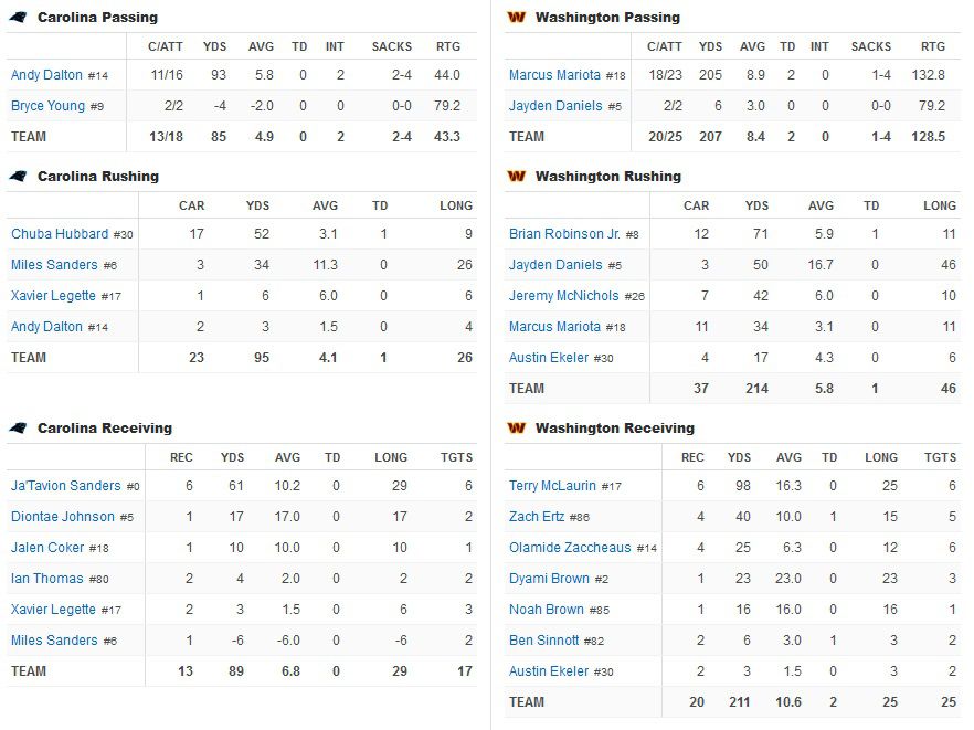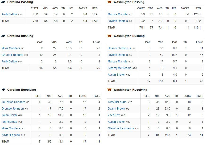 Washington had 118 rushing yards and 2 net passing yards; Brian Robinson was now tied with Jayden Daniels with 50 rushing yards. Andy Dalton was 4-8 passing with 2 interceptions and the Panthers had 43 rushing yards.