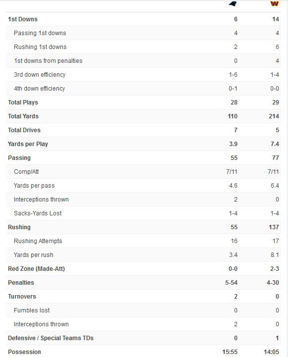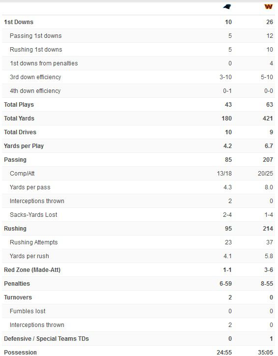 The outcome of the game was, at this point, academic. Washington had a 5-touchdown lead, and the Panthers had managed just 6 first downs (to 19 for Washington) and had converted just 1 of 6 third downs (and failed on their only 4th down attempt).