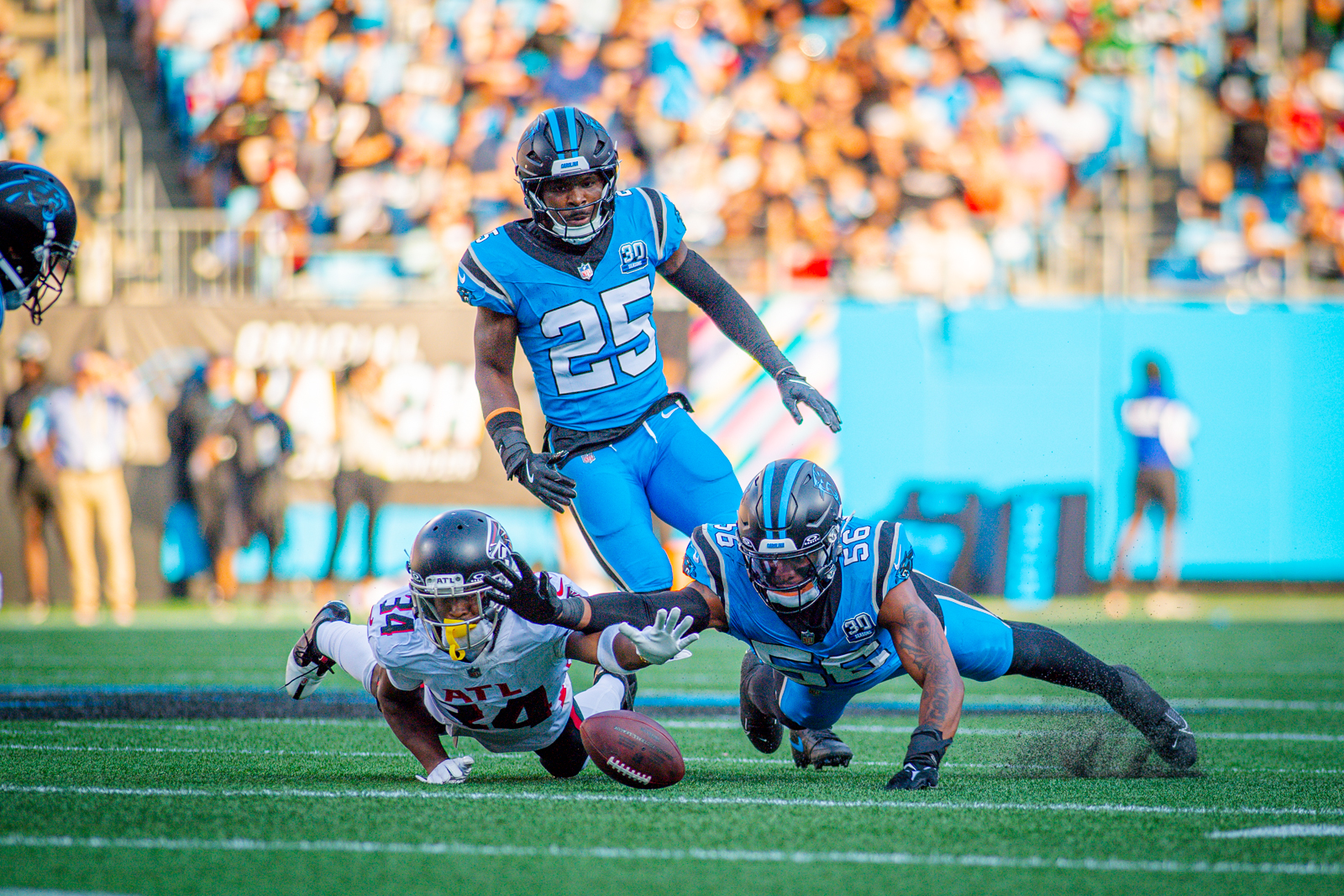 Carolina Panthers linebacker Trevin Wallace (56) dives for control of a fumble against the Atlanta Falcons on Oct. 13, 2024. Wallace, who started eight games as a rookie, returns after a shoulder injury that required surgery curtailed his season.