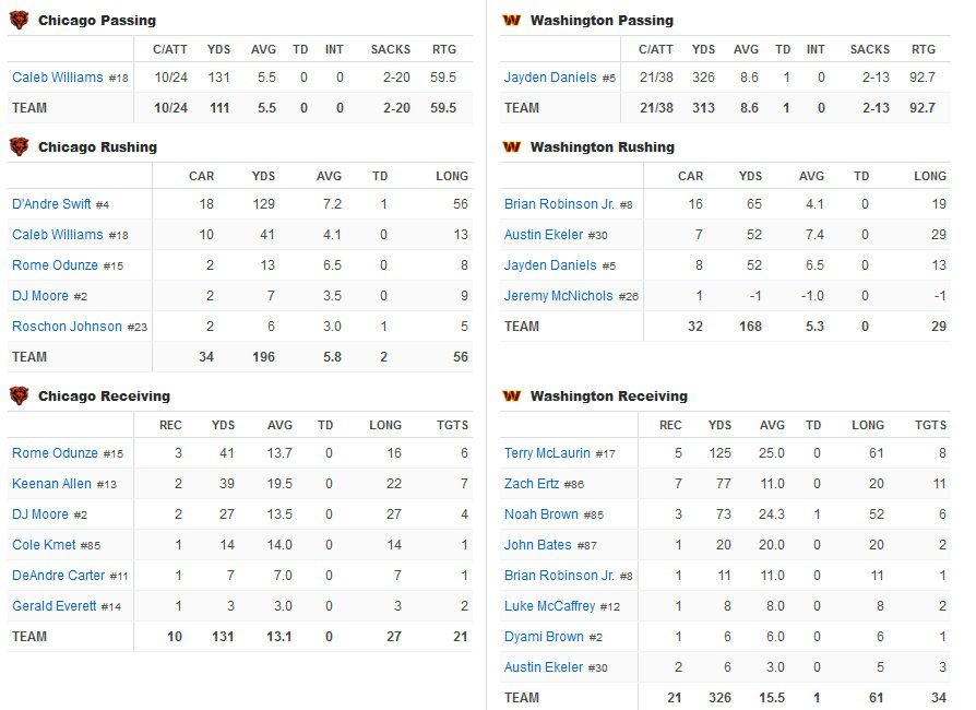 Neither the Bears nor the Commanders have yet beaten a team with a winning record, so this game offered added significance since the winner would gain legitimacy while the loser risks being seen as a paper tiger.