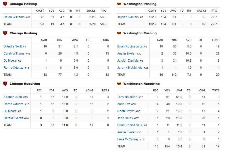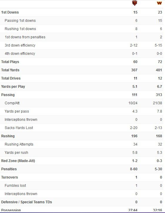 At this point, the Commanders had out-gained the Bears 195 yards to 59 yards, but led by just 9 points.