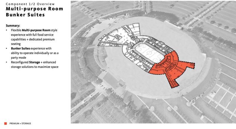 The renovated room could be configured in at least four ways: a one-room layout for an event; a two-room setup for a press conference and event; and one-room and two-room dining arrangements. A bar in the back corner of the room would be one of the few permanent fixtures. A new adjacent kitchen would be added to serve the multipurpose room and four new bunker suites that would sit across the hall, beneath the seating bowl.