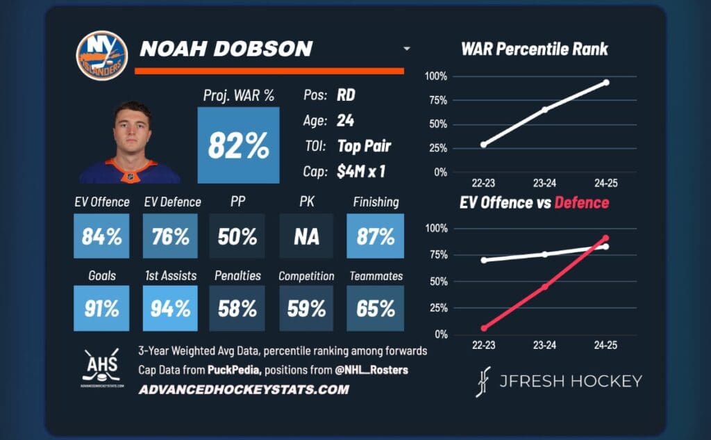 There have been some concerns about Dobson’s defensive impact, which is fair given that last season was far from his best NHL campaign. That being said, the Islanders were a mess, and Dobson’s numbers still represent a top-pairing defenceman in the NHL, both at 5v5 and on the powerplay.