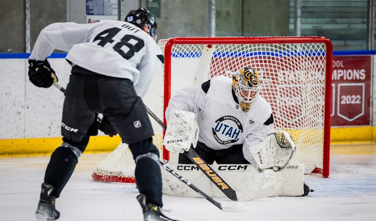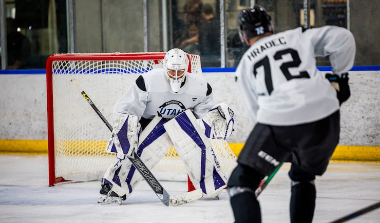 Ivan Tkach-Tkachenko tends the goal as a puck is airborne during an on-ice session at the Utah Mammoth prospect development camp at the Park City Ice Arena in Park City on Monday, June 30, 2025. | Tess Crowley, Deseret News