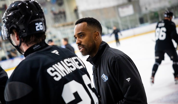 Nathaniel Brooks, Utah Mammoth development coach, left, talks to Caleb Desnoyers, right, during an on-ice session at the Utah Mammoth prospect development camp at the Park City Ice Arena in Park City on Monday, June 30, 2025. | Tess Crowley, Deseret News