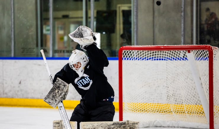 Carsen Musser tends the goal during an on-ice session at the Utah Mammoth prospect development camp at the Park City Ice Arena in Park City on Monday, June 30, 2025. | Tess Crowley, Deseret News