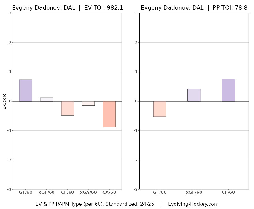 As you can see in his RAPM card from Evolving-Hockey, Dadonov will not necessarily make the team produce more shots at even strength, but he will help them convert on their scoring chances at a higher rate. In their GAR-based player cards, Dadonov was ranked in the 61st percentile of skaters in overall play and in the 66th percentile in offensive impact because he was so effective in that regard. While he is no longer a first unit mainstay on the power play, Dadonov should help the Devils’ second unit in terms of structure and shot generation, though he has been losing effectiveness there for a few years, last being a truly good PP1 option in the 2019-20 season.