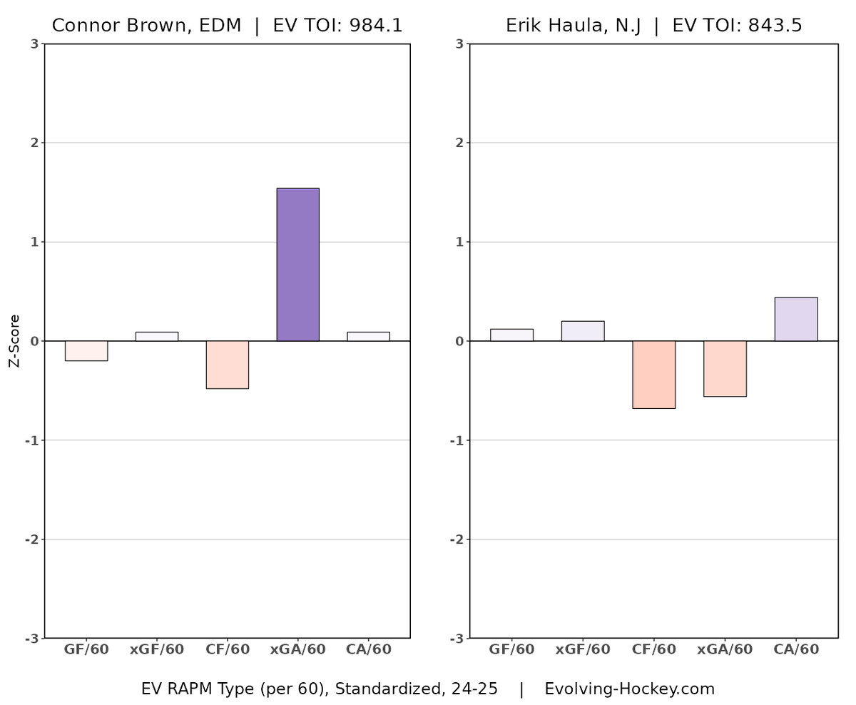 In HockeyViz’s player evaluation model, Brown lost a lot points by being a poor finisher* and a below-average passer, while also drawing close to no penalties. However, he is still a solid player who will not hurt the team on the ice, and he graded out as a low-end third-line winger in Edmonton. Of course, Brown had the severe knee injury after joining the Washington Capitals, and he had a much more productive 2024-25 season (13 goals, 17 assists) than how he played his first year in Edmonton (four goals, eight assists). So, there may be some hope that he is still returning to the form he showed in Ottawa, where he averaged 50 points per 82 games between 2019 and 2022. If he does keep the productivity on the incline, this will turn out to be a great value add for the Devils.