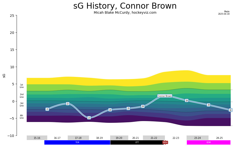 * 2:30 edit: A deeper look at HockeyViz’s data shows that Brown actually did well on his wrist shots, with 10 goals on 8.2 xG, in addition to 2 backhand goals on 1.6 backhand xG in the 2024-25 season. So, on those shots, he had 12 goals on 9.8 xG. But he had 0 goals on 2.2 deflection xG (26 recorded tips) and 0 goals on 0.8 slapshot xG (15 slap shots), which drags down his numbers a bit. Additionally, he is still dinged in their model for his poor 2023-24 season (4 goals on 10.2 xG). So, I may have been a little unfair to Brown with that comment.