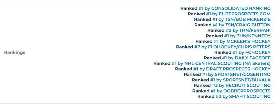 Schaefer has risen to the top of the draft by most observers, including nine out of the 10 scouts in McKenzie’s sample. While not completely unanimous, he’s the clear top player available by a majority of people who track this. Here’s some rankings from various places compiled on his Elite Prospects page: