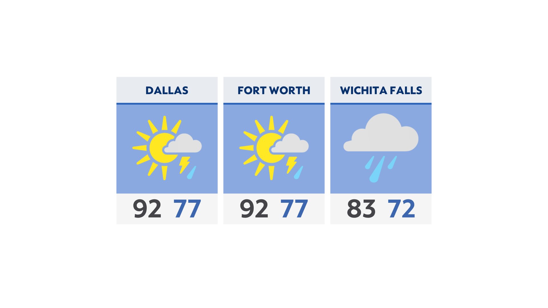 Clouds increase into the afternoon, offering scattered showers and thunderstorms to the southern half of the state. For those to the south where cloudy and wet condition prevail, highs are cooler in the upper 80s to low 90s. North Texas holds highs in the mid 90s with more sunshine mixing in.