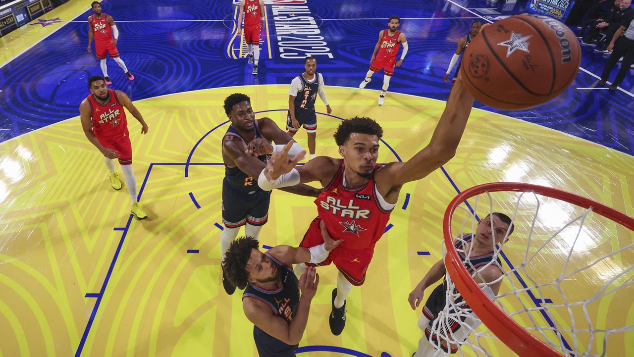 San Antonio Spurs center Victor Wembanyama, center, dunks next to Memphis Grizzlies forward Jaren Jackson Jr. during the NBA basketball All-Star game Sunday, Feb. 16, 2025, in San Francisco. (Ezra Shaw/Pool Photo via AP)