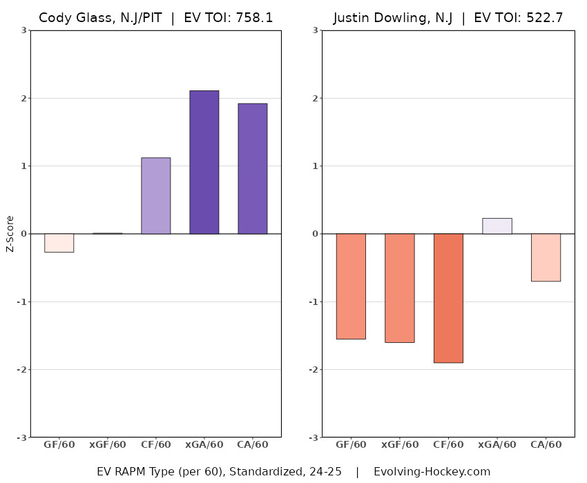 Over the last three seasons, Glass has also averaged 12 goals and 20 assists per 82 regular season games played. He has historically not been an amazing finisher with an 8.9% career shooting percentage, but showed chemistry with a few Devils last season, putting up two goals and five assists in 14 games. Glass needs to get to the net with a bit more efficiency if he wants to improve his goal scoring, given his below average shot, but he is a good passer and a responsible two-way player. In HockeyViz’s player evaluation model, Glass grades as a high-end third-line center because of his strong defensive impact. Evolving-Hockey’s RAPM model, shown below (compared to Dowling), agrees. And at 6’3” and over 200 pounds, Glass has the size to withstand the burdens of being a bottom six center.