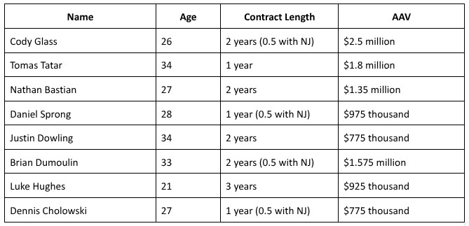 The other 7 are made up mostly of mercenaries. 4 of them were added late in the season. I wrote a half year with NJ in parentheses, as I did not want to calculate exactly what percentage of the season they played with the Devils, but in reality, none of those four guys played with NJ for more than 20 games or so, and so they were really with the team for a very short time. Those four- Cody Glass, Daniel Sprong, Brian Dumoulin, and Dennis Cholowski- were pure rentals. There is a chance Glass returns, as he is an RFA despite being 26 years old, but otherwise, these guys were all brought in for right now. There was no long-term connection with the team at all.
