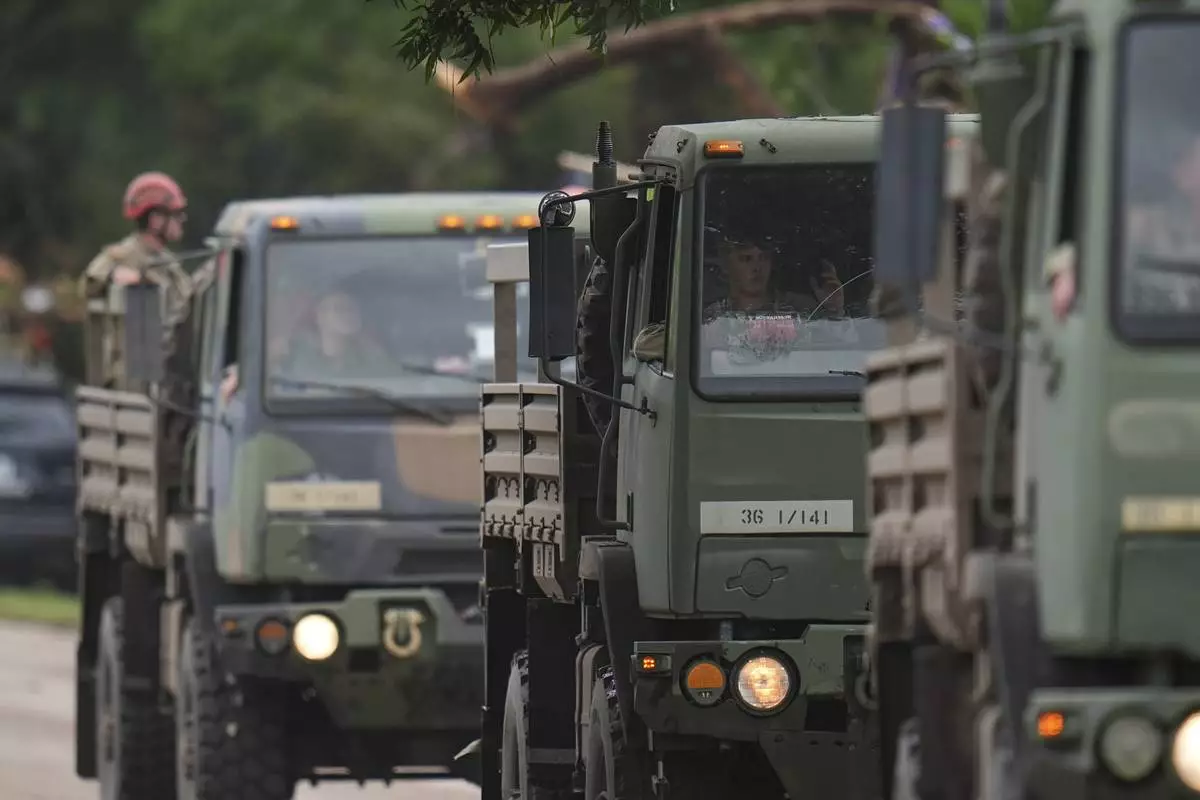 A military convoy drives on a road along the Guadalupe River after a flash flood swept through the area Saturday, July 5, 2025, in Hunt, Texas. (AP Photo/Julio Cortez)