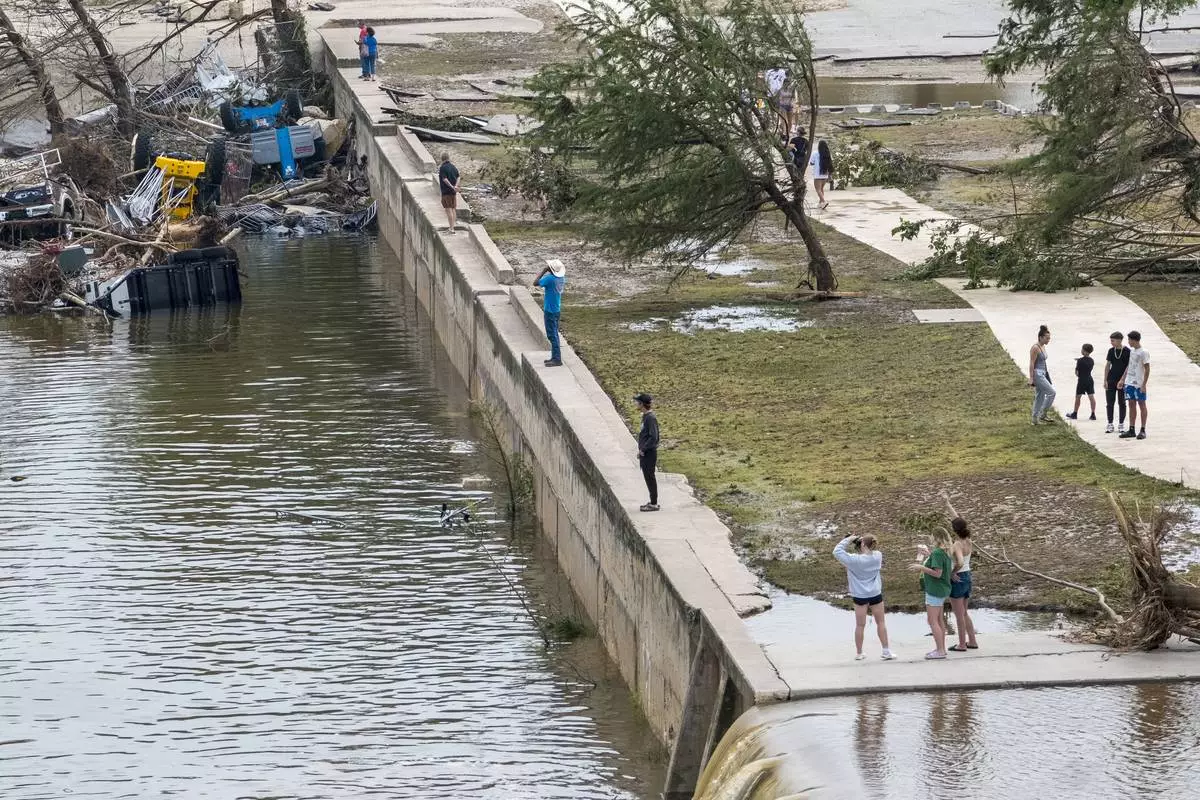 Onlookers survey damage caused along the Guadalupe River after a flash flood swept through the area, Friday, July 4, 2025, in Kerrville, Texas. (AP Photo/Eric Gay)