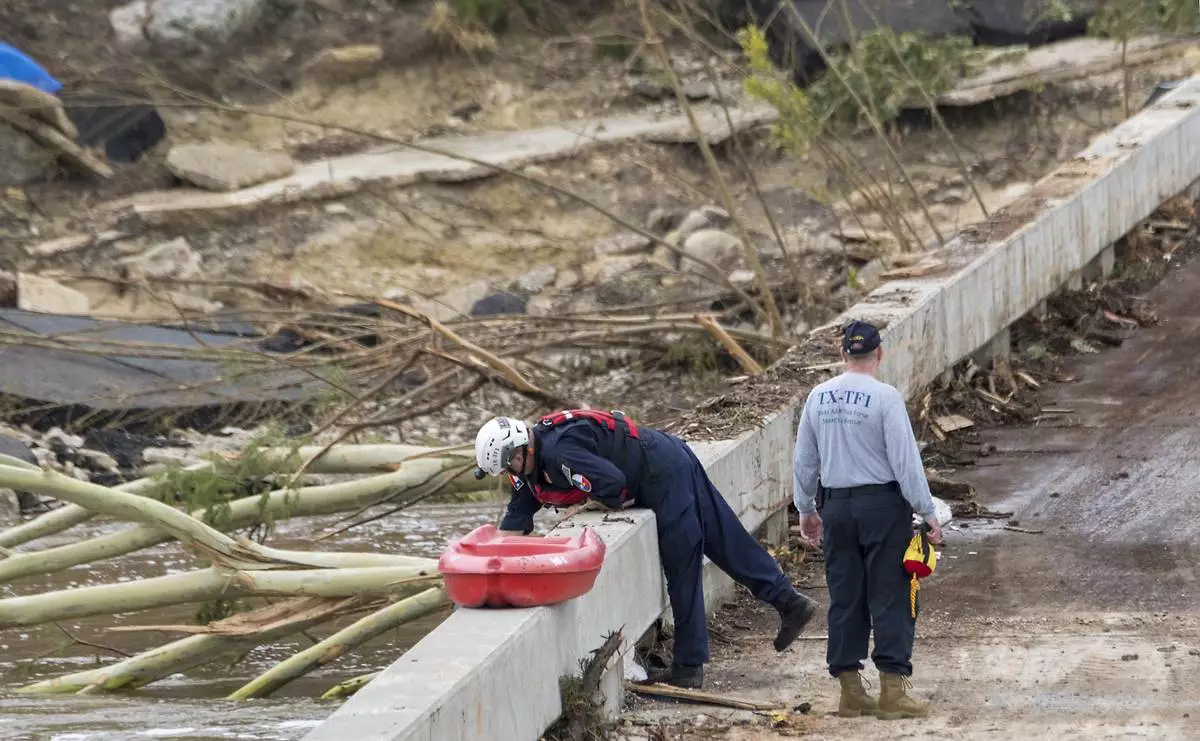 Members of the Texas A&M Task Force 1 Search & Rescue inspect the Cade Loop bridge along the Guadalupe River on Saturday, July 5, 2025, in Ingram, Texas. (AP Photo/Rodolfo Gonzalez)