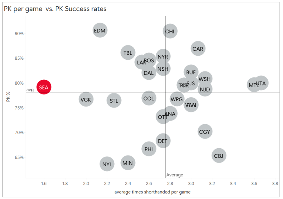 The Kraken’s penalty kill has been average, but they’ve done a good job of staying out of the box. Over their last 15 games, they’ve been shorthanded the fewest times in the league.