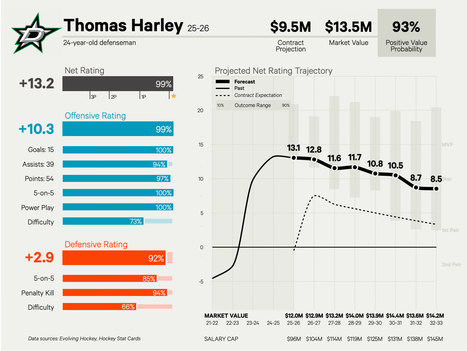Harley may be the number two to Miro Heiskanen in Dallas, but he stepped up in Heiskanen’s absence to showcase what his ceiling is. The question is whether Heiskanen’s contract serves as an internal cap of sorts at $8.45 million a year. That was worth 10.4 percent of the cap back in 2021, which equates to $10.8 million in a projected $104 million salary cap in 2026-27. Evolving-Hockey’s model suggests something in between: a $9.53 million cap hit on an eight-year deal, which would be team-friendly with his ability and trajectory in mind.