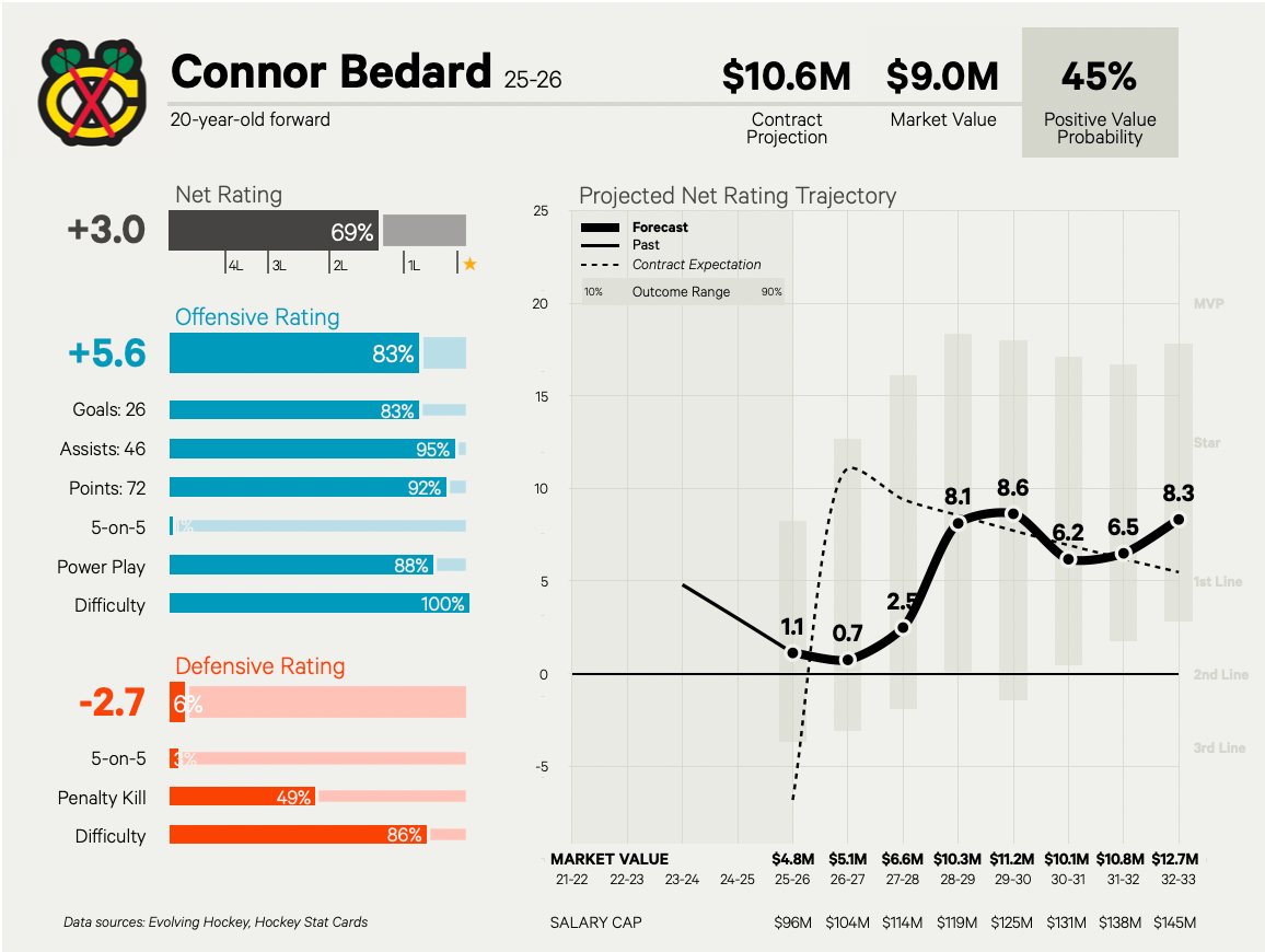 Evolving-Hockey points to a $10.6 million AAV over the next eight years, which is true superstar money for someone his age. It’s above what Bedard is projected to be worth over that span, but that could easily change if he starts hitting his stride more consistently.
