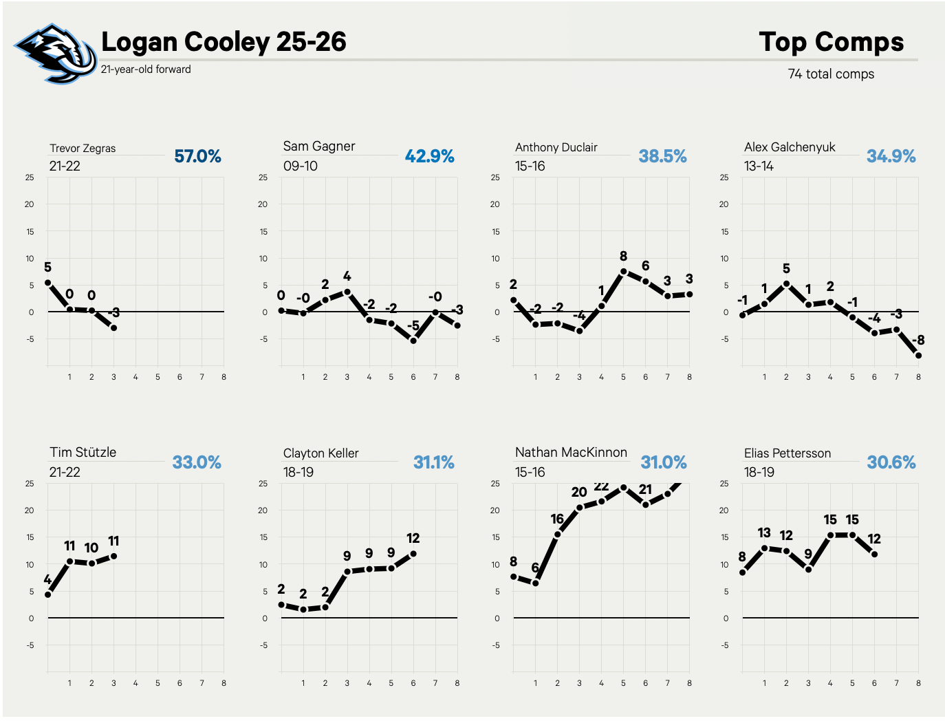 Some of Cooley’s top comps support that idea, with Keller, Nathan MacKinnon and Elias Pettersson in mind. But there’s also a complementary player track he could follow, like Trevor Zegras and Anthony Duclair. Sam Gagner and Alex Galchenyuk paint a more concerning picture.