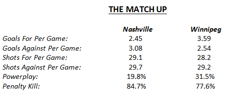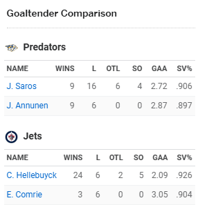Moving onto how Winnipeg & Nashville’s seasons have unfolded this season, below is how the statistics look when you compare them head-to-head. ESPN also keeps us informed by conveniently displaying how the Jets & Preds’ goalies are doing this year.