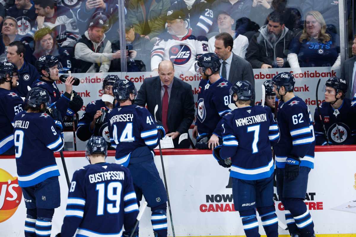 Dec 30, 2024; Winnipeg, Manitoba, CAN; Winnipeg Jets assistant coach Davis Payne strategizes against the Nashville Predators during the third period at Canada Life Centre. Mandatory Credit: Terrence Lee-Imagn Images