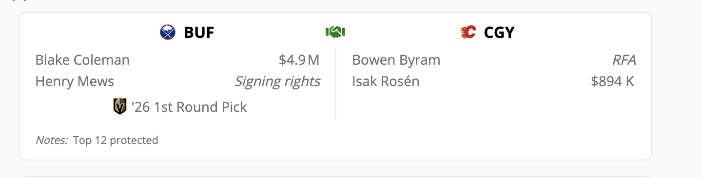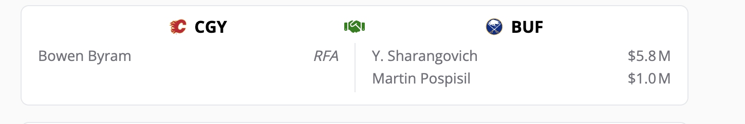 Verdict: Unsure. It looks great on paper. However, I do worry about the logjam the Flames are currently dealing with on the back end. Signing Byram allows a cushion in the top four, giving Zayne Parekh and Hunter Brzustewicz time to develop and not rush them into full-time roles.