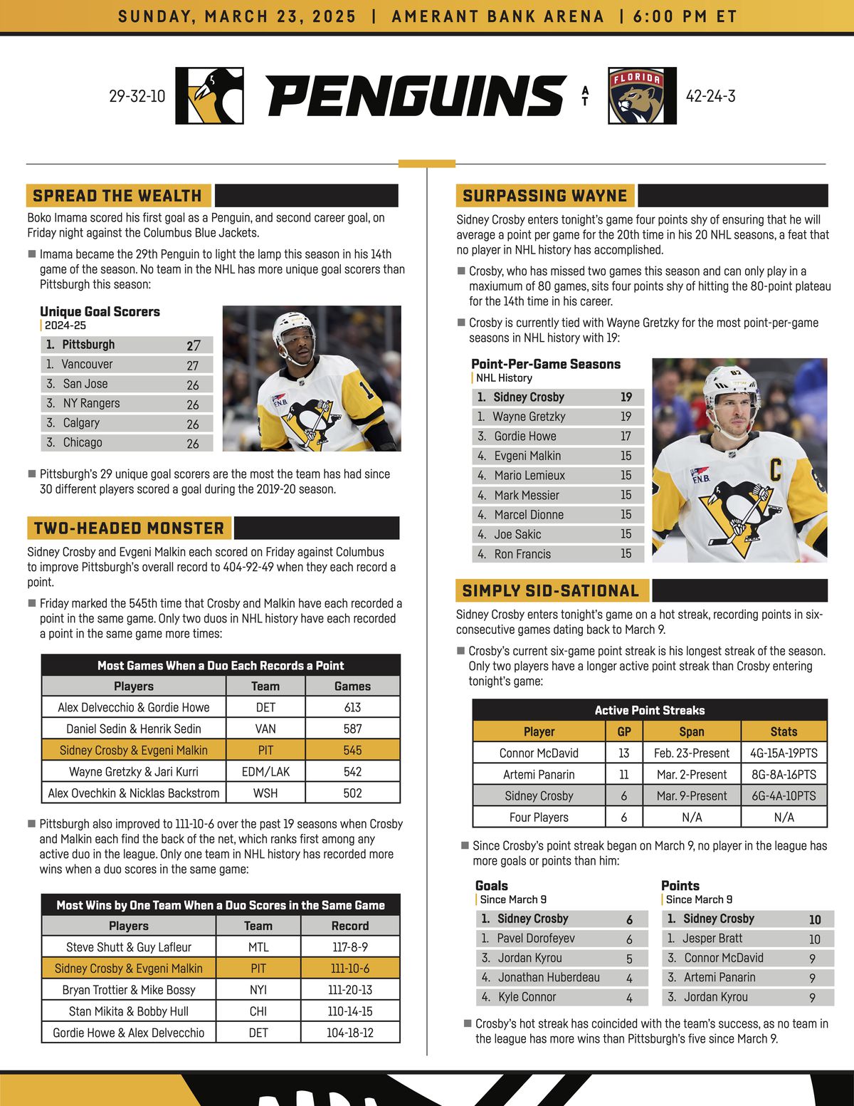 Who: Pittsburgh Penguins (29-32-10, 68 points, 7th place Metropolitan Division) @ Florida Panthers (42-25-3, 87 points, 2nd place Atlantic Division)