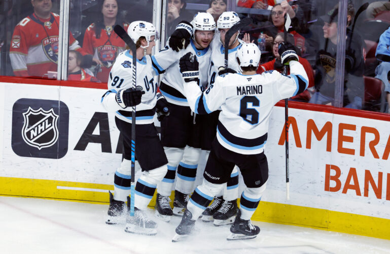 Utah Hockey Club defenseman Sean Durzi (5)) celebrates after his goal with teammates during the third period of an NHL hockey game against the Florida Panthers on Friday, March 28, 2025, in Sunrise, Fla.