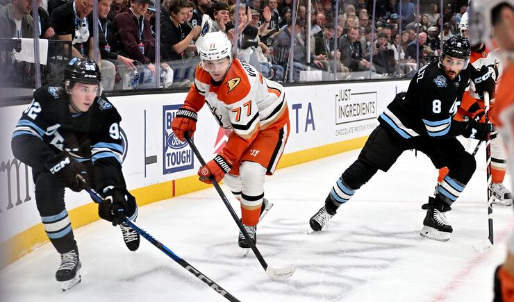 Utah Hockey Club left wing Michael Carcone (53) looses the puck as he splits Anaheim Ducks defenseman Drew Helleson (43) and Anaheim Ducks left wing Alex Killorn (17) as the they play at the Delta Center in Salt Lake City on Wednesday March 12, 2025. Utah won 3-2. | Scott G Winterton, Deseret News