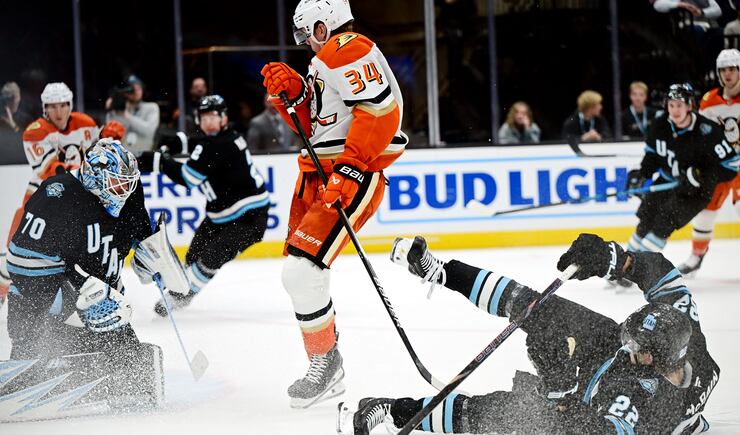 Utah Hockey Club goaltender Karel Vejmelka (70) stops a shot as Anaheim Ducks defenseman Pavel Mintyukov (34) tries to flip the puck into the goal as they play at the Delta Center in Salt Lake City on Wednesday March 12, 2025. Utah won 3-2. | Scott G Winterton, Deseret News