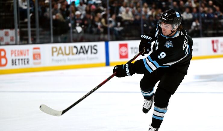 Utah Hockey Club center Clayton Keller (9) shoots as they play the Anaheim Ducks at the Delta Center in Salt Lake City on Wednesday March 12, 2025. | Scott G Winterton, Deseret News