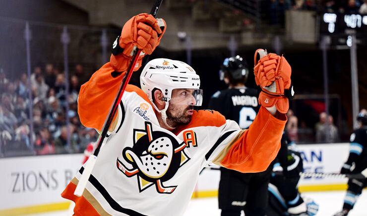 Anaheim Ducks left wing Alex Killorn (17) celebrates scoring a goal as they and the Utah Hockey Club play at the Delta Center in Salt Lake City on Wednesday March 12, 2025. | Scott G Winterton, Deseret News