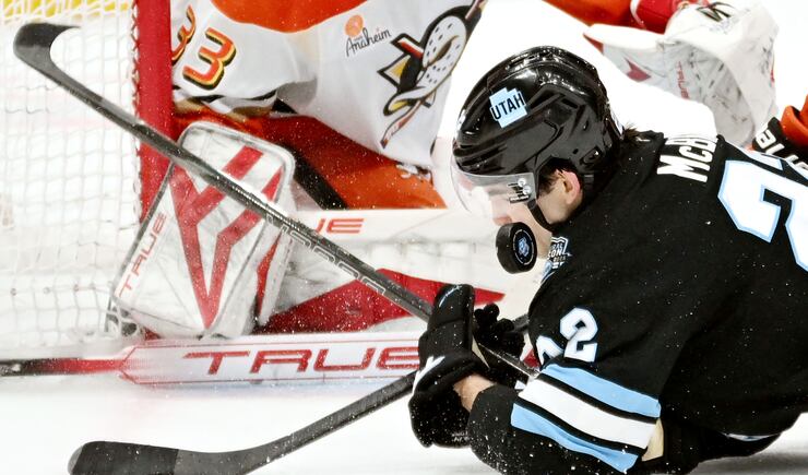 Utah Hockey Club center Jack McBain (22) has the puck bounce up near his head as he slides on the ice as they and the Anaheim Ducks play at the Delta Center in Salt Lake City on Wednesday March 12, 2025. Utah won 3-2. | Scott G Winterton, Deseret News
