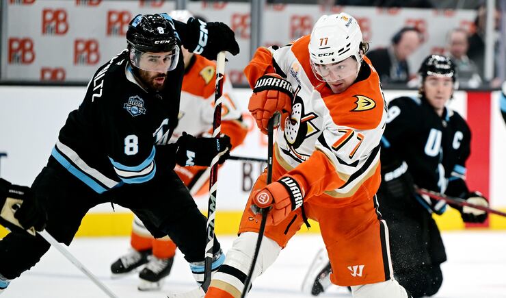 Anaheim Ducks right wing Frank Vatrano (77) shoots as Utah Hockey Club center Nick Schmaltz (8) tries to defend as they play at the Delta Center in Salt Lake City on Wednesday March 12, 2025. | Scott G Winterton, Deseret News